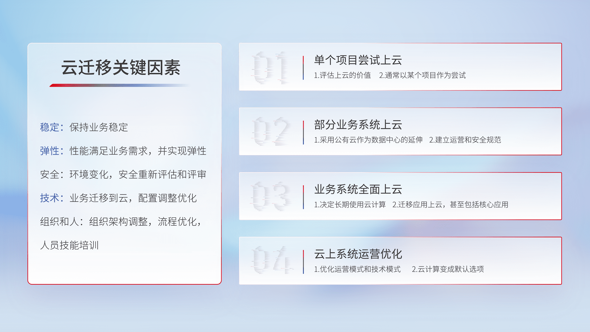 结合实际业务,,从规划设计、、云平台选型、、、、云原生改造、、数据迁移、、集成交付,,,,迁移全过程为客户识别最佳上云路径,,,做好风险识别管理,,设计网络架构、、、身份权限、、、、安全审计合规、、、操作审计、、、日志审计、、、、监控告警策略、、多站点容灾设计等,,,,对云上基础设施进行整体规划,,提升IT治理水平,,,,以满足弹性、、、高可用、、、高性能的需求。。。